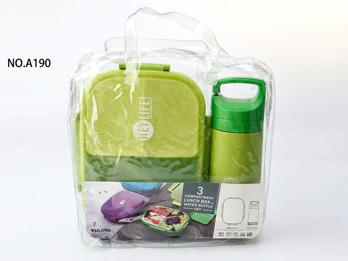紋彩密封3格飯盒+水壺OPP袋/PVC袋套裝(長(zhǎng)方形900+350ml)