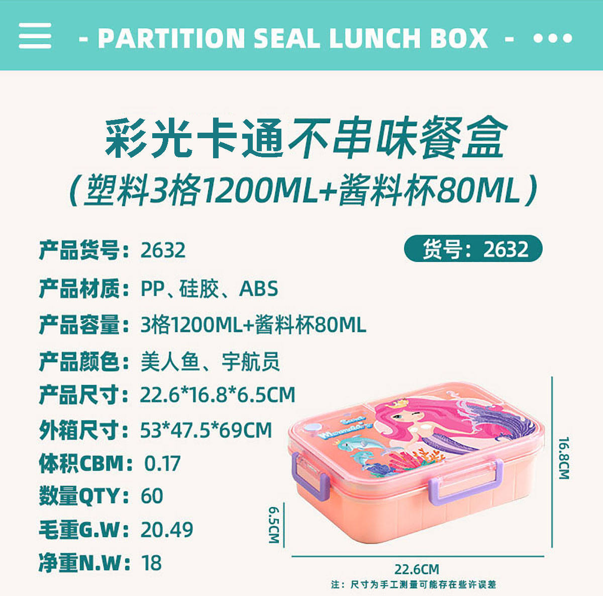 Size: AQX-2631:226*168*65mm/塑料2格1200ml+醬料杯80ml AQX-2632:226*168*65mm/塑料3格1200ml+醬料杯80ml