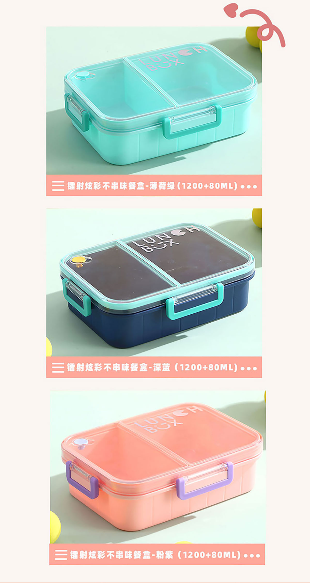 Size: AQX-2633:226*168*65mm/塑料2格1200ml+醬料杯80ml AQX-2634:226*168*65mm/塑料3格1200ml+醬料杯80ml
