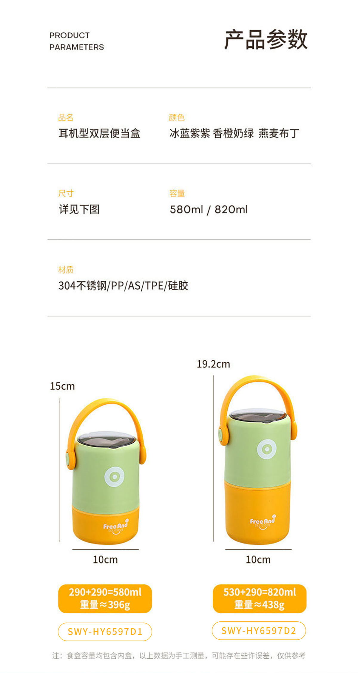 SWY-HY6597D2(高款):Φ100*192mm/530+290ml=820ml