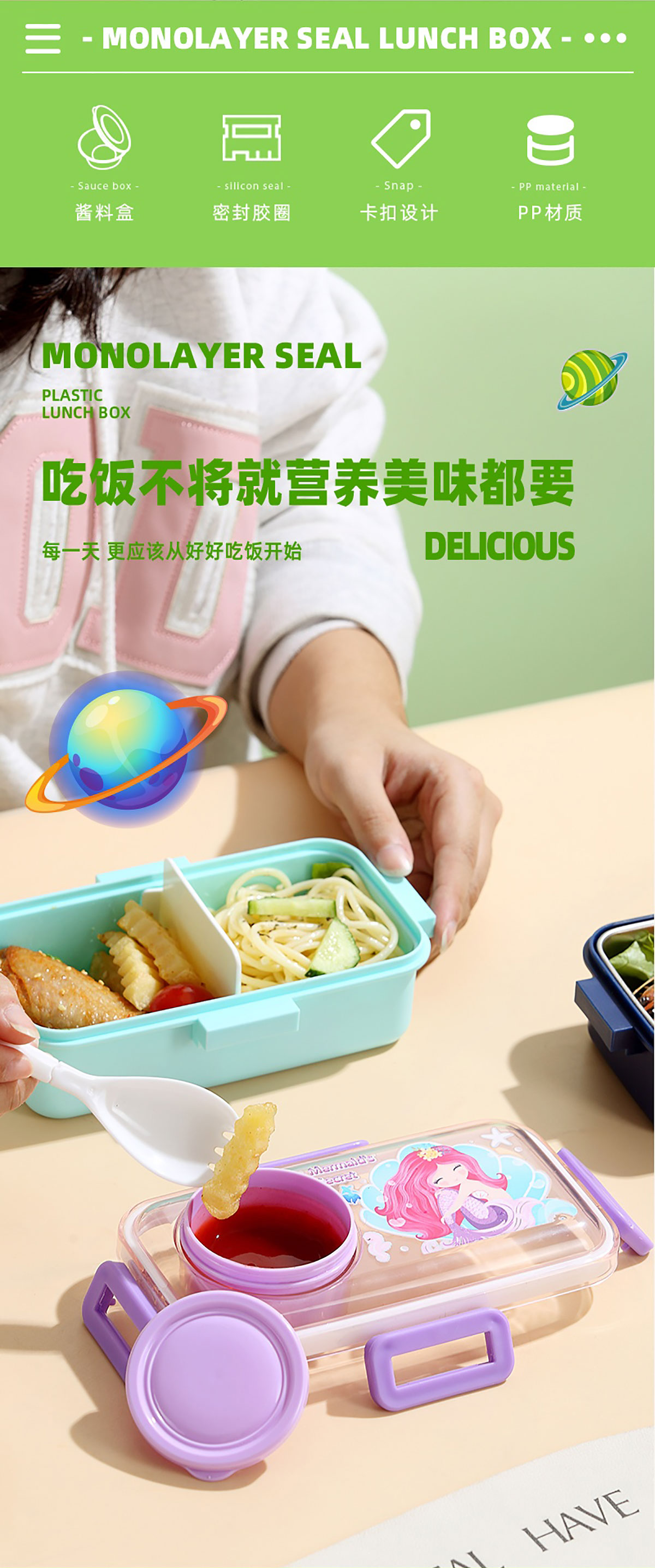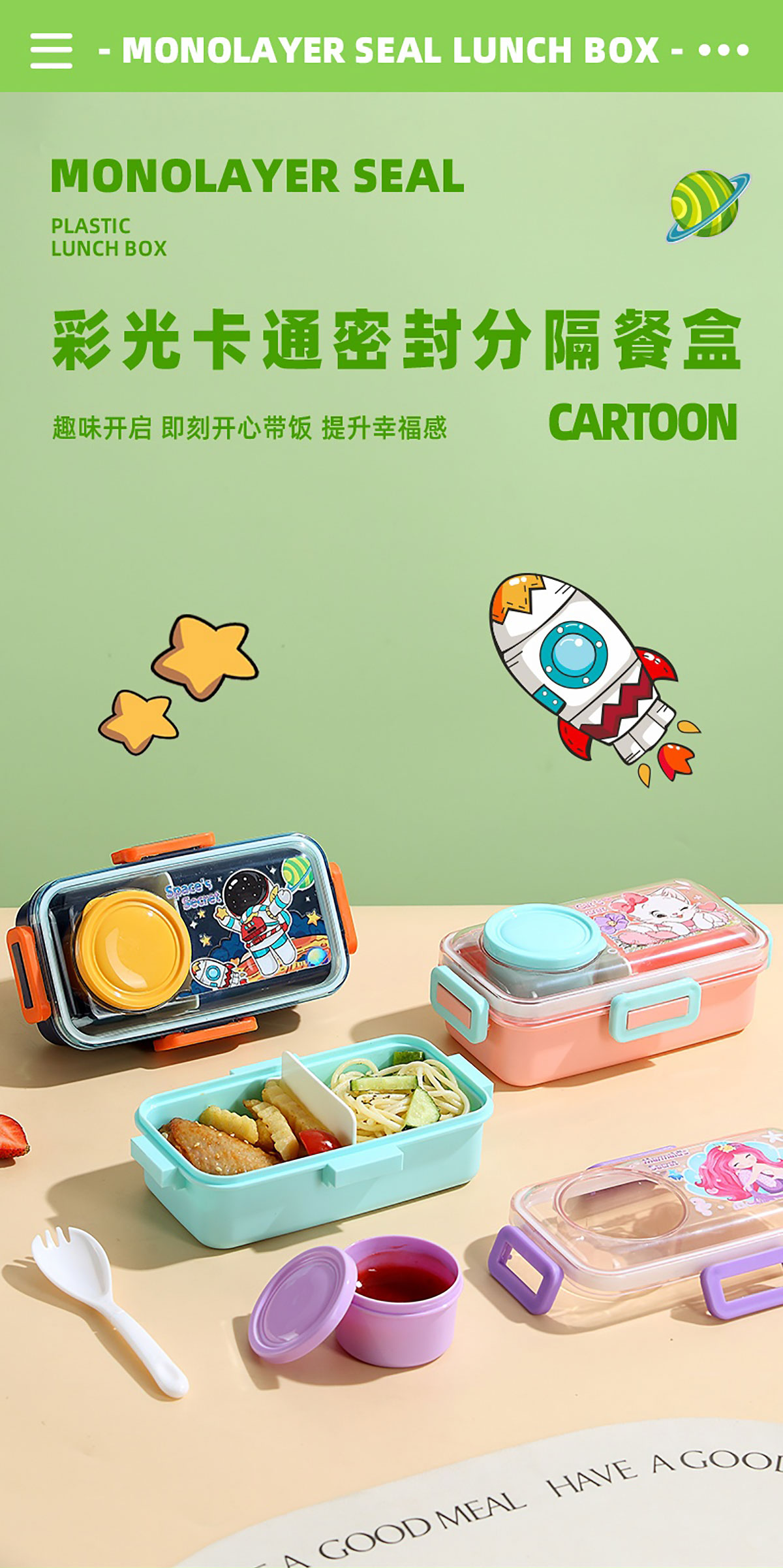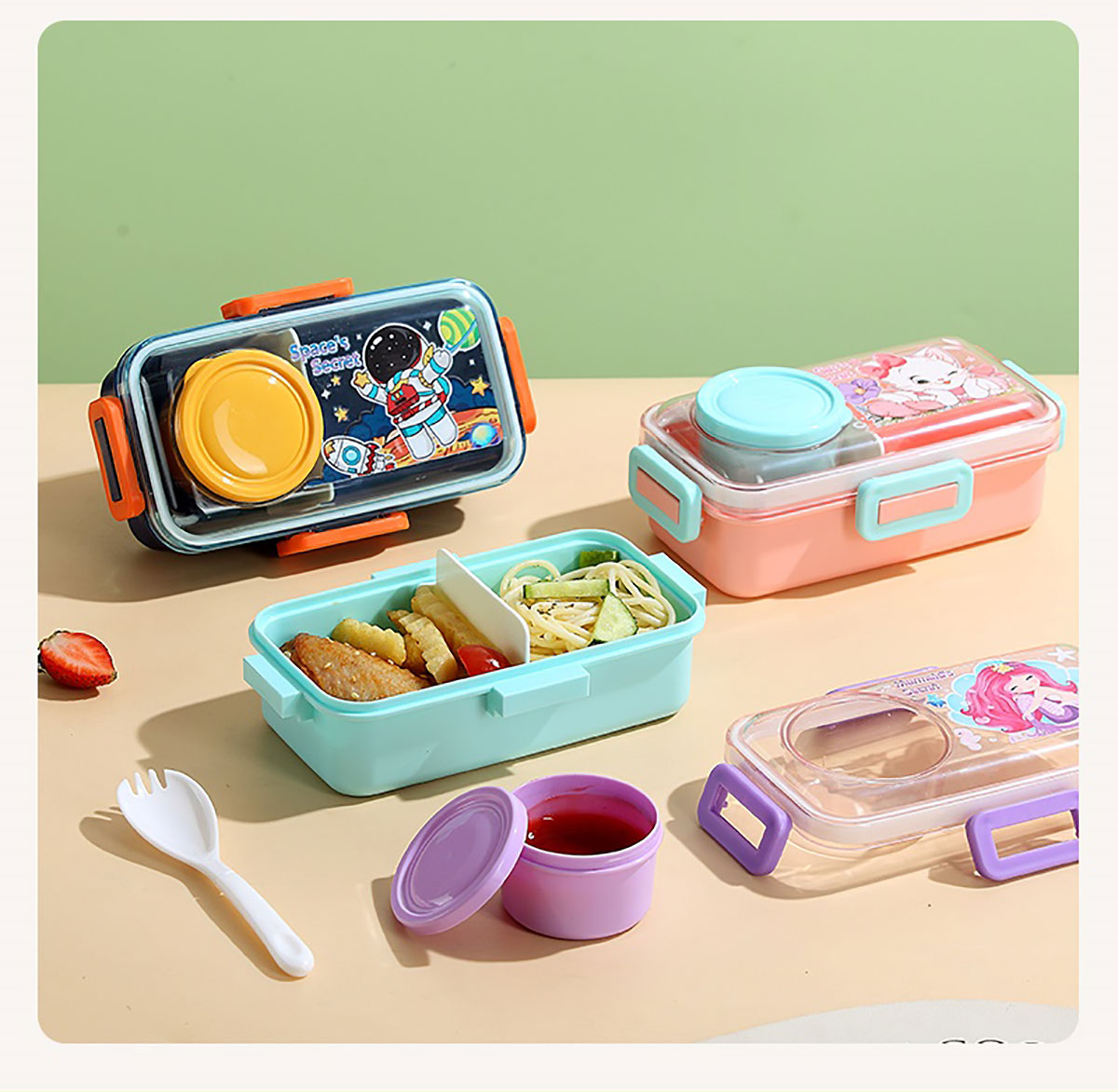 彩光卡通密封餐盒(單格500ml+外置醬料杯80ml+pp勺)