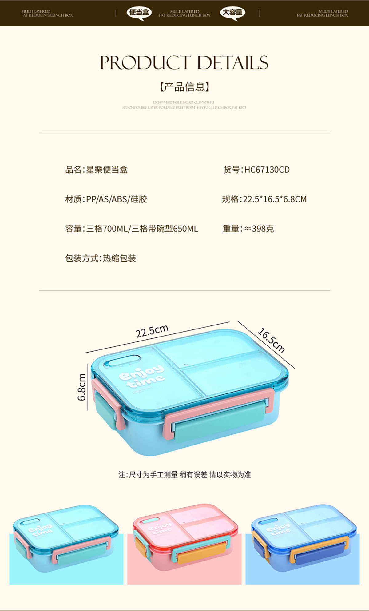 Size: 225*165*68mm(三格700ml/三格帶碗650ml)